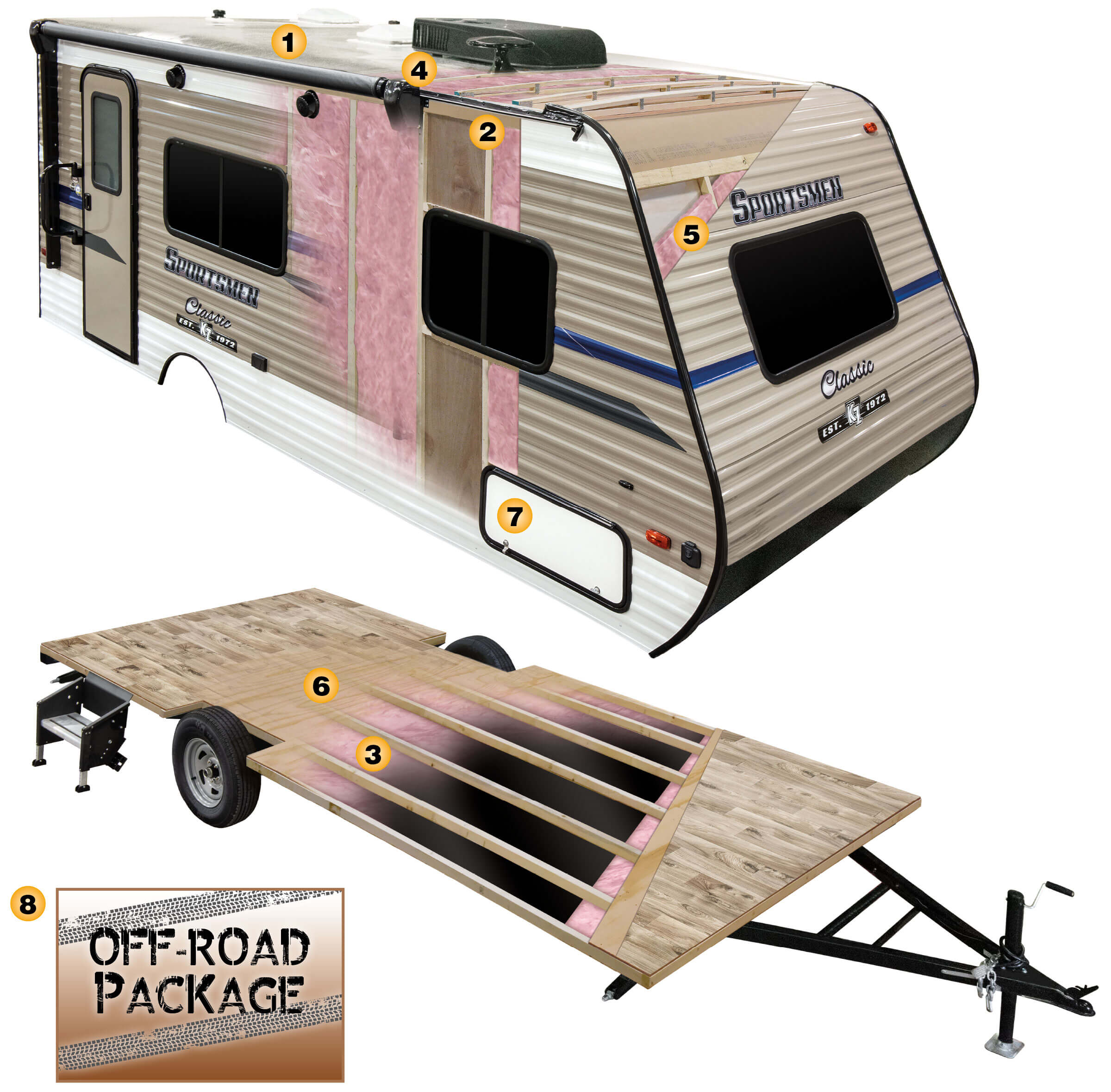 The Off-Road Package includes 15-inch mud tires with aluminum rims, extra ground clearance, an electronically-controlled heated holding tank, and double entry step.