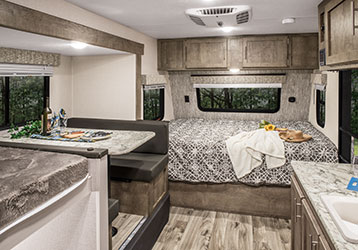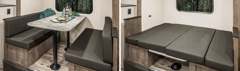Bench-seat dinette is big enough for family meals, then folds down neatly for comfortable sleep space. (181BH shown)