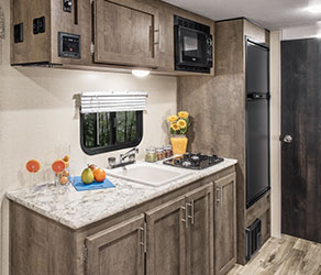 Kitchens feature a deep kitchen sink, large enough for filling pots and pitchers, microwave, two-burner cooktop, centralized cabinet-end control panel and optional 7-cubic-foot refrigerator (shown). (181BH shown)