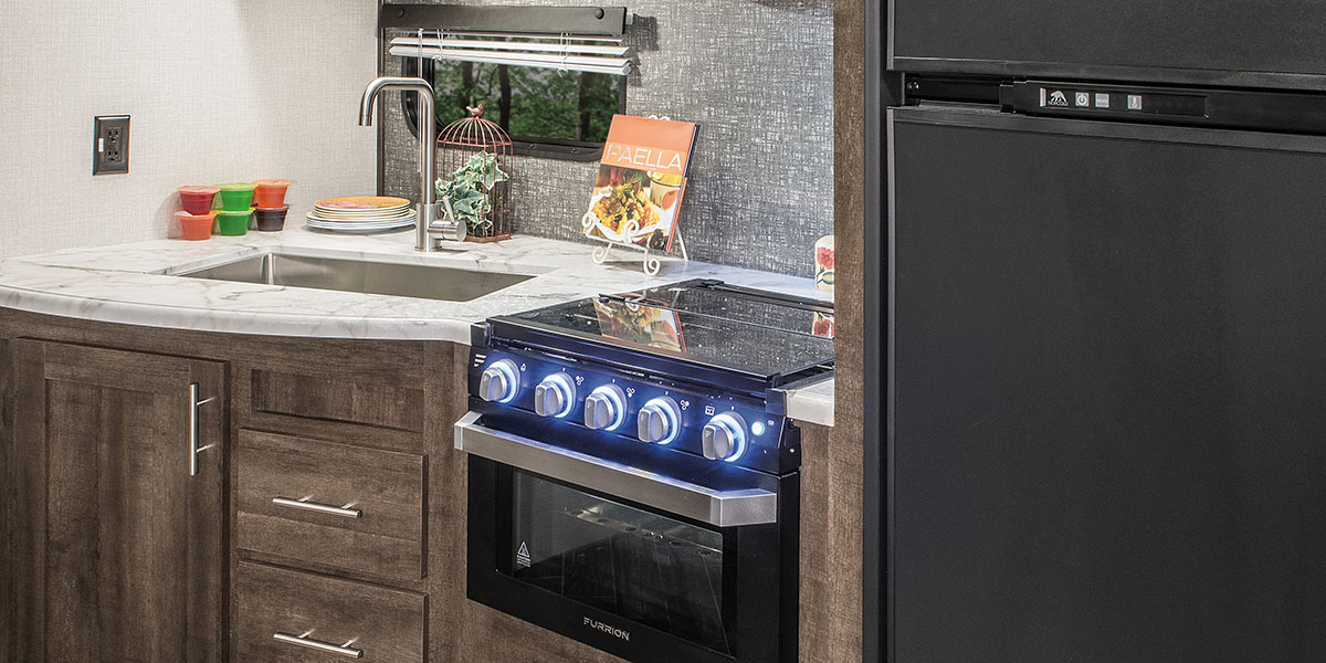 Great LE kitchen with seamless counters, stainless sink and high-rise faucet, drop-in cooktop with glass cover, oven & microwave. (200THLE shown)