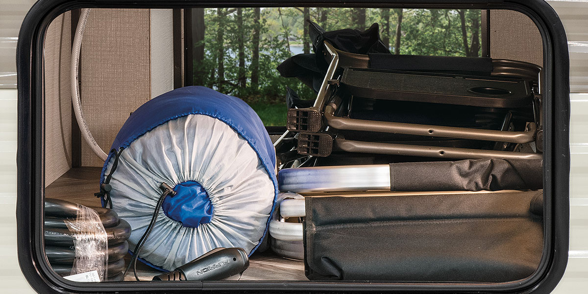 Spacious garage converts to living space, with 70-inch rollover sofa and free-standing table, windows with privacy covers, secure overhead storage and TV mount. (200THLE shown)