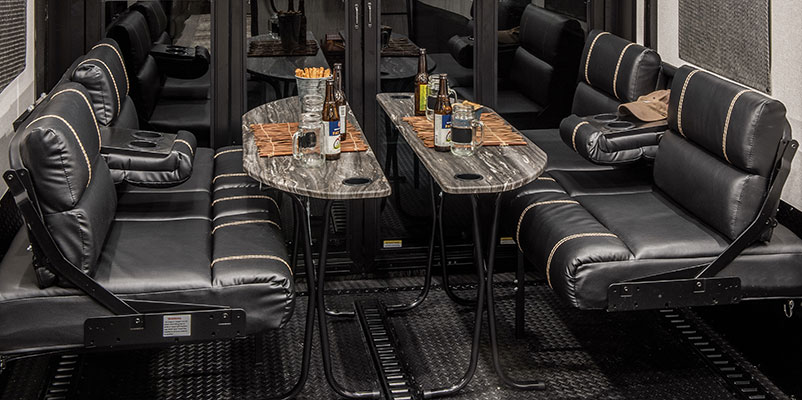 Quickly transform the garage from hauling your toys into a lounge area and a roomy bedroom, with optional 60 x 84-inch sit-and-sleep power bed. Add options like ramp door patio rails, three season patio door. (V3916TK shown)